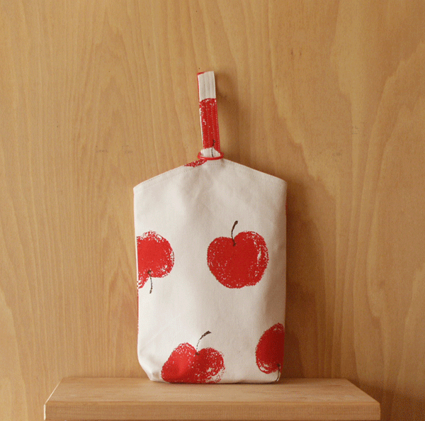 固めのキャンバス地にクレヨンで 描いたようなりんごプリント柄シューズ入れ 縦25cm 横20cm まち5cm袋の中布は赤と白のギンガムチェック 固めのキャンバス地 綿100%氏名票は袋の内側についています。