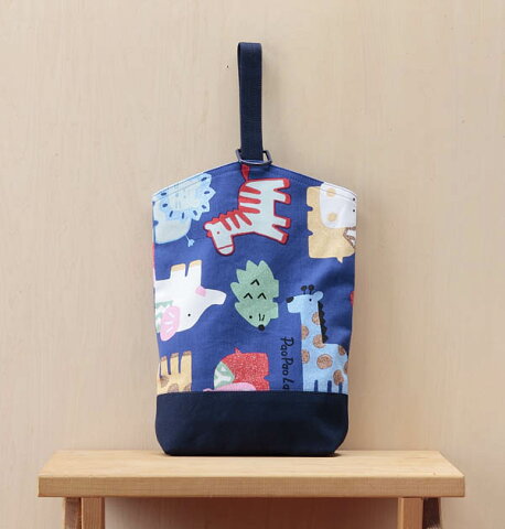 紺地にライオン、しまうま、きりん、ぶた、ぞう、かば、はりねずみがプリントされています。